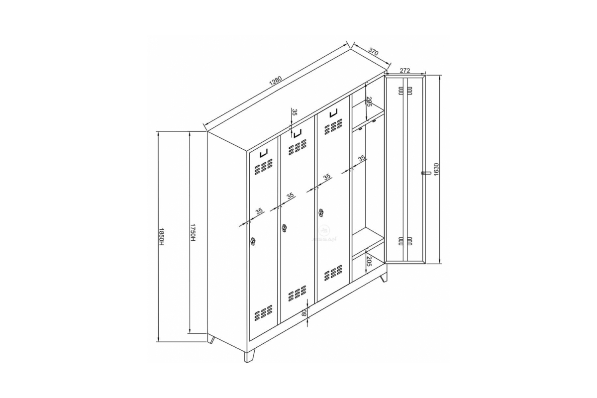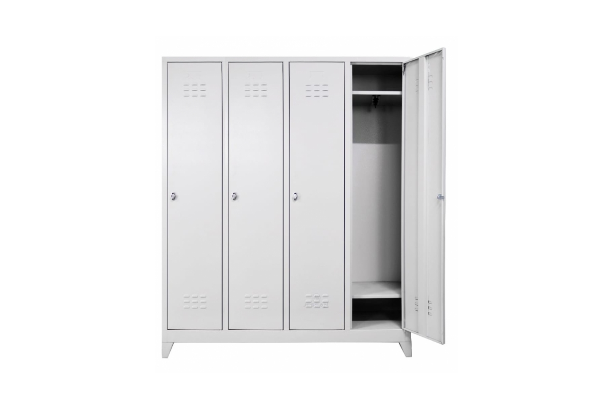 | 4 lü Yanyana Soyunma Dolabı Gri | Boyutları: Genişlik:128cm Derinlik: 37cm Yükseklik: 185cm Ürün Özelliği: Havalandırma Izgaraları, İsimlik, Plastik askı kancaları, Pim Menteşe, Asma kilit takmaya uygun kilit sistemi. |